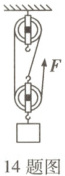 14. 如图所示,用125 N的拉力$F$,把重力为300 N的木箱匀速提升3 m,滑轮组的机械效率为