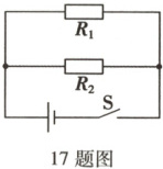 17. 如图所示,$R_1$的电阻为5 Ω,闭合开关后,通过电阻$R_1$和$R_2$的电流分别为0.6 A和0.3 A,求: