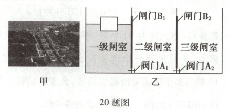 20.三峡船闸是世界上最大的船闸。如图甲所示,船在船闸中要经过五个闸室,实现船体的逐次降低或升高。实践小组制作的船闸模型如图乙所示,用两个隔板把大鱼缸分成三个长方体容器,每个容器内的底面积均为500 $cm^2$,隔板上均安装了闸门和阀门(体积均忽略不计),用重为6 N、底面积为200 $cm^2$的不吸水的长方体木块代替船。“工作过程”如下: