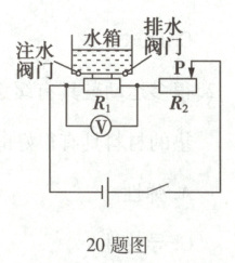 20. 小明发现家中马桶的冲水量(水箱单次排水的质量)较大,浪费水资源。于是设计了可以调节马桶冲水量的装置,简化原理图如图所示,$R_1$为力敏电阻,其所受压力每减小1 N阻值增大1 Ω,当水箱注满水时,$R_1$的阻值为10 Ω;$R_2$为滑动变阻器,滑片 P 每移动1 cm,其接入电路的阻值变化5 Ω。该装置通过在电压表上设置“触发电压”控制水箱的停止排水和自动注水,当电压表示数达到“触发电压”时,排水阀门被关闭,停止冲水,同时注水阀门被打开,自动将水箱注满水。设置好“触发电压”后,在水箱注满水的前提下,通过调节滑片 P 的位置,设置不同的冲水量,当滑片 P 在阻值最大位置时,冲水量最大。水箱内注满水,滑片 P 从阻值最大位置向左移动5 cm,闭合开关,电压表示数为1 V;在滑片 P 位置不变的情况下,若设置“触发电压”为2 V,冲水量为1.5 kg。