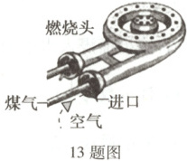 13. 长春市桂林路美食街的某商家使用煤气灶烹饪食物,煤气灶燃烧头如图所示。使用煤气灶时,打开煤气阀门,拧动点火装置,煤气和空气在进口处混合流向燃烧头被点燃。