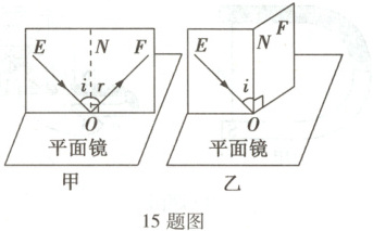 (1) 如图甲所示,使一束光贴着纸板E入射到O点,观察反射光。实验中,从不同方向都能在纸板F上看到反射光,是因为光在纸板F上发生了