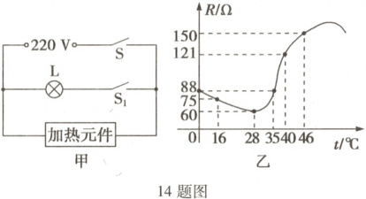 14. 某加热器简化电路如图甲所示,其加热元件是利用新型材料制成的,它的电阻R随温度t变化的关系图像如图乙所示;照明灯L标有“220 V 100 W”。此加热器白天只加热不照明,夜晚加热并照明。