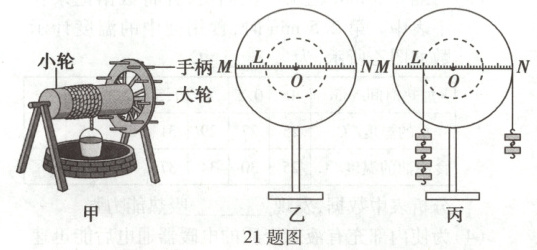 21.(6分)某小组在参观古代科技展时,看到一汲水装置——辘轳,如图甲所示。讲解员介绍:辘轳是古人利用他们的智慧发明创造的工具,解决了提水费力问题。它是主要由大轮和小轮组成的轮轴装置。使用它能够实现“四两拨千斤”。辘轳静止时满足杠杆的平衡条件。
