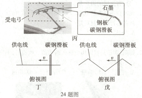 如图丙,受电弓安装在高铁车厢的顶部,受电弓的碳钢滑板与供电线接触。如果碳钢滑板的同一位置与供电线持续摩擦,会缩短碳钢滑板的使用寿命,更会影响动车组的运行安全,那么图
