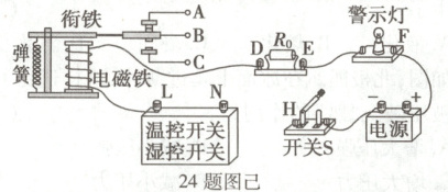 某小组设计了一个冻雨预警电路,如图己所示。闭合S后,当环境温度低于0℃(温控开关闭合)且空气湿度高于80%(湿控开关闭合)时,警示灯一直发光并出现持续的亮暗交替现象,发出预警。已知:电源电压恒为6 V,定值电阻$R_0$为10 Ω,警示灯有“6 V 0.5 A”。当电磁铁线圈中的电流I≥0.1 A时,电磁铁吸下衔铁,使动触点与下方静触点接触。为实现预警功能,温控开关与湿控开关应