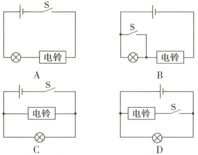 9. 某兴趣小组要为居家老人设计一个“应急呼叫器”电路,要求:开关断开时,电灯和电铃均不工作;开关闭合时,灯亮铃响,即使电灯因断路不亮,电铃仍可工作。如图所示的电路中,符合设计要求的是 (