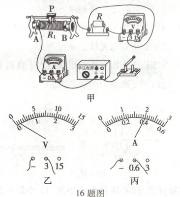 (4)排除故障后,当接入$5\Omega$的定值电阻,调节滑片 P 使电压表示数达到所要控制的电压$U_{1}$时,电流表指针如图丙所示,其示数为