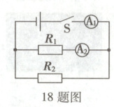 18. 将阻值为$10\Omega$的电阻$R_{1}$与另一电阻$R_{2}$接入电源电压恒定的电路,如图所示。闭合开关 S,电流表$A_{1}$的示数为$0.45A$,电流表$A_{2}$的示数为$0.3A$。求: