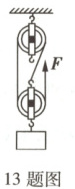 13. 用如图所示滑轮组将重$300\ N$的物体匀速提升$1\ m$,拉力$F$大小为$120\ N$,有用功为