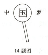 14.10 远离 小于10cm [解析]凸透镜能够将平行光会聚于一点(焦点),焦点到凸透镜光心的距离为焦距,由题意可知该凸透镜的焦距为10cm。由凸透镜成像规律可知,当$u < f$时,成正立、放大的虚像,应用该原理的是放大镜,因此凸透镜和书本的距离应满足的条件是小于10cm。由凸透镜成虚像时“物远像远像变大”的规律可知,小明想看到更大的正立的“国”字,需要将凸透镜远离书本。