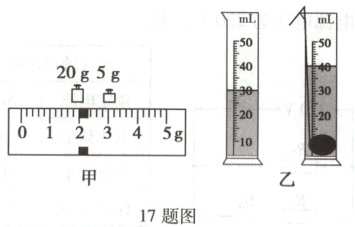 17. 小明测量某种矿石样品的密度,天平平衡时右盘所加砝码及游码的位置如图甲所示,图乙是矿石样品放入量筒前后的情況,由测量可得矿石样品的质量为