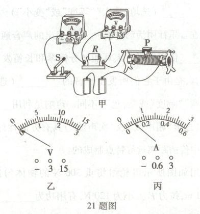 21. (8分)小明在“探究通过导体的电流与电阻的关系”实验中,他用图甲所示的电路进行实验,实验中电阻$R$两端的电压始终保持$2\ V$不变,电路中仪表均完好无损。