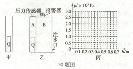 (3)广西夏季雨水充沛,每逢暴雨,河水水位快速上涨,为了监测河水水位,某项目小组设计了“智能水位报警器”,如图乙所示。其由 A、B 两部分组成,A 模拟控制器,B 模拟河道。其中 A 内部高度为 0.7 m,顶部固定着压力传感器,当压力达到某一数值时,报警器会自动报警。在某次注水测试中,当注水到某一深度时,Q 开始漂浮,随着注入水的深度增加,Q 最终会与传感器接触,当 Q 露出水面的长度为 0.1 m 时,报警器恰好开始报警。请通过计算,分析从开始注水到报警器报警的过程,并在丙图中作出此过程 Q 底部受到水的压强 p 随注入水的深度 h 变化的关系图线。