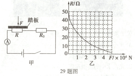 29. (8分)公路部门往往通过地磅检测汽车载重情况。图甲是跨学科学习团队设计的可视化地磅的电路原理图,主要由踏板(重力不计)、压力传感器 R、显示承重的仪表(实质为电流表,量程为$0 \sim 0.6 \ A$)等组成,R 的阻值与所受压力 F 的大小关系如图乙所示。电源电压为 12 V,定值电阻$R_0$的阻值为 5 $\Omega$。