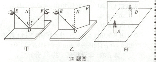 。②如图丙所示,把点燃的蜡烛 $A$ 放在玻璃板前,再拿一支外形相同但不点燃的蜡烛 $B$ 竖立着在玻璃板后面移动,直到看上去它跟蜡烛 $A$ 的像完全重合,说明平面镜所成的像与物体大小相等,这种研究方法是物理学中常用的