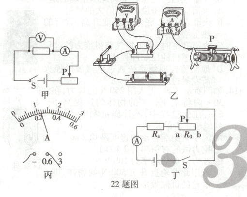 。(5)小滨用电流表和一个已知最大阻值为 $R_0$ 的滑动变阻器测量未知电阻 $R_x$ 的阻值,设计了如图丁所示的电路图,电源电压未知且保持不变,实验操作如下:
