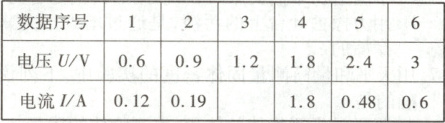 (3)题图丙中电流表选用的是0~0.6A量程,分度值为0.02A,读数为0.24A。分析表格数据可求得6次实验中定值电阻的阻值分别为$R_1=\frac{U_1}{I_1}=\frac{0.6V}{0.12A}=5\Omega$、$R_2=\frac{U_2}{I_2}=\frac{0.9V}{0.19A} \approx 5\Omega$、$R_3=\frac{U_3}{I_3}=\frac{1.2V}{0.24A}=5\Omega$、$R_4=\frac{U_4}{I_4}=\frac{1.8V}{1.8A}=1\Omega$、$R_5=\frac{U_5}{I_5}=\frac{2.4V}{0.48A}=5\Omega$、$R_6=\frac{U_6}{I_6}=\frac{3V}{0.6A}=5\Omega$。根据第4次实验数据计算出来的阻值与其他不同,可知第4组数据有误。