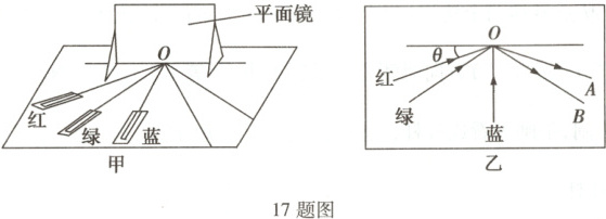 17.小吉进行“探究光的反射定律”实验。如图甲所示,把白纸放在水平桌面上,将平面镜垂直压在纸面上,让红、绿、蓝三束不同颜色的激光射向平面镜的同一点$O$,用笔描绘出光路,如图乙所示。