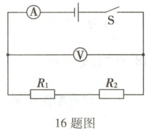 16.下图所示的电路中,$R_1=2\ \Omega$,$R_2=4\ \Omega$,闭合开关S后,电流表的示数为0.5 A。求: