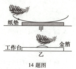 14. 手工打造的金箔轻薄柔软,不能用手直接拿取,正确拿取的方法是手持羽毛轻轻扫过纸垫,如图甲所示,再将羽毛靠近工作台上方的金箔,如图乙所示,羽毛即可将金箔吸住,这是为什么?