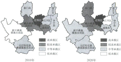 资源环境承载力是指在自然生态环境不受危害并维系良好生态系统前提下,一定地域空间的资源禀赋和环境所能承载的经济规模和人口规模,反映了社会经济发展与资源开发和环境保护之间的关系。下图分别示意2010年和2020年云南省玉溪市各县级行政区资源环境承载力空间分析结果。据此完成下面小题。