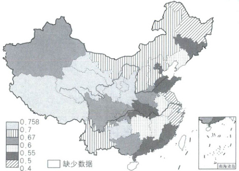 [广东2025学业水平测试模拟五]人口压力指数是指一个区域现有人口数量与经济人口容量之比,当人口压力指数小于1时,说明该地区人口压力较小,人口容量相对富裕,下图是我国某年各省级行政区的人口压力指数分布示意图。据此完成下面小题。
