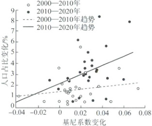 人口分布基尼系数能反映人口分布的集中程度,基尼系数最大为1,最小为0,基尼系数越接近0表示人口分布越均衡。下图示意2000—2020年我国部分省级行政区基尼系数变化与其行政中心人口占比变化关系。据此完成下面小题。