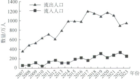 [山东临沂2025高一期中]下图示意2007—2023年我国某地区流动人口数量变化,该地区人口主要流入地为长三角及珠三角地区。据此完成下面小题。