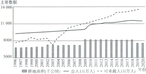 耕地的人口承载力主要以耕地产出的粮食总产量所能承受的人口数量来衡量。下图为我国河南省1996—2020年的耕地人口承载力状况。读图,完成下面小题。