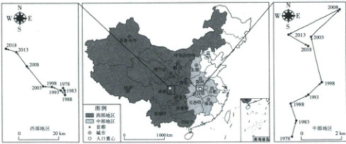 [海南 2023·1~2]人口重心是指区域空间中人口数量可维持空间均衡的受力点,其时序变化可反映区域发展的空间演变轨迹。随着西部大开发、中部崛起等国家发展战略的实施,区域内人口重心迁移明显。下图示意 1978—2018 年我国中部和西部地区人口重心迁移轨迹。据此完成下面小题。