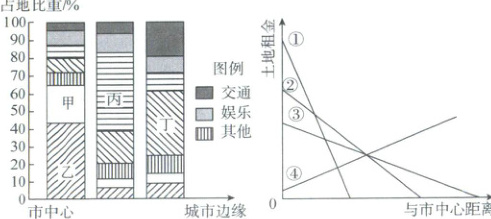 4.A【解析】本题考查影响地租的因素。一般距离市中心越远,地租越低,④错误。结合上题分析可知,以乙、丙、丁为主的功能区分别为商业区、居住区、工业区。图中①②③付租能力随与市中心距离的增大而变化,表现为①线变化最快,②线次之,③线变化最慢,由所学分析可知,乙、丙、丁所属功能区理论付租能力依次对应①②③。A正确。