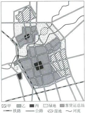 5.D【解析】本题考查城市功能分区。城区规划的过程中需要适当保留一定规模的绿地和河湖等生态涵养空间,起到净化空气、美化环境的作用,A错误;根据所学知识分析,甲、乙、丙功能区依次是工业区、居住区、商业区,地租随着与市中心距离变近而依次升高,B错误,D正确;该城区总体规划较为合理,故盛行风不可能是自工业区方向吹来的东南风,C错误。