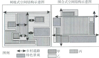 2.D【解析】本题考查不同乡村空间结构的特点。相比围合式空间结构,树枝式空间结构农田相对分散,A错误;道路系统布局方式有差异,但均较为完善,B错误;生活景观主要通过院落判断,相比围合式,树枝式院落相对分散,面积并不大,并未明显突出生活景观,C错误;与围合式空间结构相比,树枝式空间结构最突出的特点是林地占比较大,合围在院落周边,突出自然生态景观,D正确。