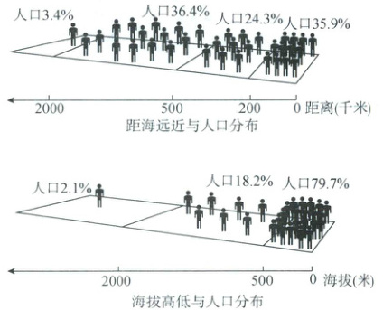 3.C【解析】本题考查读图分析能力。读图可知,距海500千米以内的人口占比为35.9%+24.3%,约为60%,A错误;分布在海拔2000米以上的人口占总人口的2.1%,B错误;近80%的人口分布在海拔500米以下的区域,C正确;大部分人口分布在距海500千米以内的区域,D错误。
