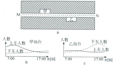 [北京大学附属中学2025高一期末]图a中,甲、乙为我国内地某大城市主干街道两侧公交车同一站点的两个站台。经统计,工作日不同时刻上下车人数随时间变化有明显差异,如图b、c所示。读图,完成下面小题。