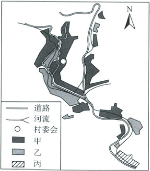 4.B【解析】本题考查乡村土地利用。由图可知,甲的面积最大,且村委会位于甲内,故应为居住用地,乙主要分布在居住区附近,方便村民耕种,为农业用地;商业区是后来发展起来的,面积较小且沿道路分布,靠近河流,环境优美,丙为商业用地,B正确,A、C、D错误。