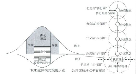 知识拓展 TOD模式是以公共交通为导向的发展模式。其中的公共交通主要是指火车站、机场、地铁、轻轨等轨道交通及公交车干线,然后以公交站点为中心、以400~800米(5~10分钟步行路程)为半径建立中心广场或城市中心,其特点在于集办公、商业、文化、教育、居住等于一身的“混合用途”,使居民和雇员在不排斥小汽车的同时能方便地选用公共交通工具、自行车、步行等多种出行方式。城市重建地块、填充地块和新开发土地均可以TOD的理念来建造,TOD的主要方式是通过土地使用和交通政策来协调城市发展过程中产生的交通拥堵和用地不足的问题。