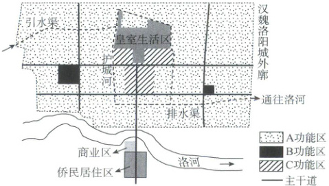 洛阳因位于洛河北岸而得名,其历史悠久,被誉为“十三朝古都”。下图示意汉魏时期都城洛阳的城市功能分区,主要有皇室生活区、行政办公区、居住区、商业区、侨民居住区五种。