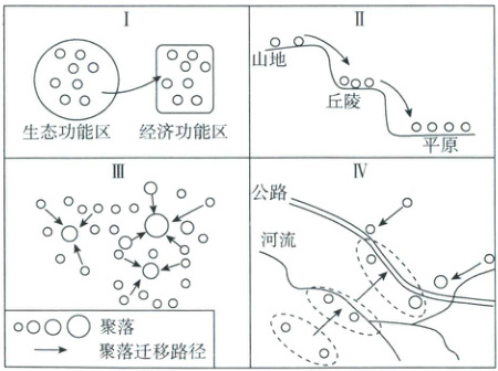 [江西九江一中2025高一月考]随着乡村振兴战略的有效实施,我国乡村聚落空间分布发生了明显变化。下图为江南丘陵某区域四种乡村聚落空间演化模式示意图。据此完成下题。