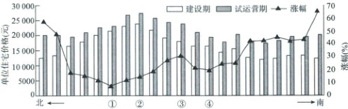 [广东梅州2024高一期中]某省会城市的地铁1号线大致呈南北走向纵跨城市中心区和边缘区。下图示意1号线建设期和试运营期沿线各站点周边的住宅平均价格及其增幅。读图,完成下面小题。