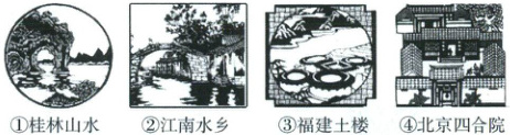 ①桂林山水 ②江南水乡 ③福建土楼 ④北京四合院