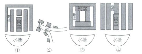 ①是“围梳式布局”的传统村落,②是“顺水排列式布局”的传统村落,③是“包围式布局”的传统村落,④是“梳式布局”的传统村落。A正确,B、C、D错误。