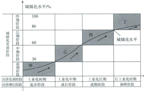 3.D 【解析】本题考查城镇化发展阶段。读图并结合所学知识,乙位于城镇化中期阶段,会出现环境质量下降等各种城市病,D正确;城镇化发展速度快,大量人口涌向城市,D正确;郊区城镇化处于中期阶段,A错误;逆城镇化处于后期阶段,B错误;虚假城镇化指的是城镇化水平明显超过工业化和经济发展水平的城镇化,C错误。