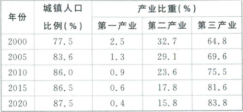 [天津河东区2025高一期末改编]随着城镇化的发展,很多在北京工作的人选择定居河北省,涿州、固安、大厂、香河等地成为北京的“睡城”,每日跨省上班的京漂族,白天赶往北京市区上班,晚上回到河北的家中睡觉。到2020年北京市城镇化率达到87.5%,下表示意2000—2020年北京市城镇人口比例与产业结构变化。据此完成下面小题。