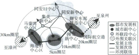 [内蒙古通辽 2024 高一 月考]福建省厦门市陆地面积约 1 700 $km^2$,由厦门岛、鼓浪屿、海沧半岛等组成,形成“多中心、组团式”的城市空间形态。厦门市交通压力大,本地居民职住通勤是交通压力的主要来源。下图示意以厦门岛为中心的空间规划。据此完成下题。