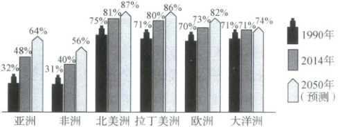 [辽宁 2025 高中学业水平测试模拟]下图为世界各地区不同年份的城镇化水平示意图。据此完成下题。