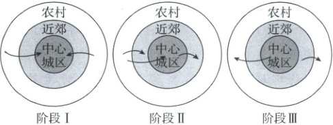 1 C 【解析】本题考查城镇化过程中的问题。由图分析可知,阶段Ⅲ为逆城镇化阶段。人口向农村等地区迁移,中心城区人口减少,经济萎缩,C正确。“交通拥挤,污染严重”“房价过高,住房紧缺”出现在城镇化中期阶段,A、B错误。逆城镇化与性别比例失衡无关,D错误。