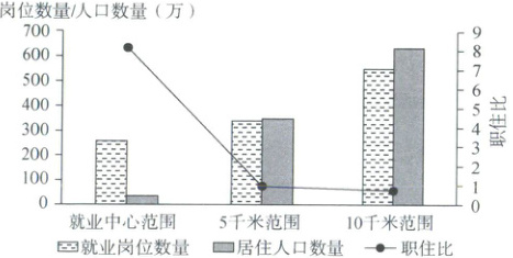 [广东2025高中学业水平考试模拟六]人口职住分离是一种居民工作地与居住地相距较远的现象。我国某大城市人口职住分离问题显著,下图为该城市的就业中心及距离就业中心5—10千米通勤圈范围内的人口职住状况图。据此完成下面小题。