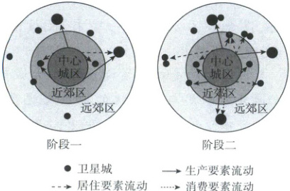 [吉林东北师范大学附中2024摸底考试]城镇化促使居住、产业等诸多要素向郊区迁移。传统郊区化集中于中心城区的近郊区,而后郊区化则更倾向于远郊区。上海已经进入后郊区化时代,远郊功能空间更加复杂多元。下图示意上海市后郊区化空间发育模式演变。据此完成下面小题。